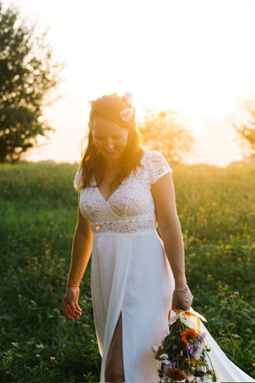 Elle a choisi la robe Agnès de la créatrice Elsa Gary, qu'elle a personnalisé avec un beau décolleté cache cœur devant.