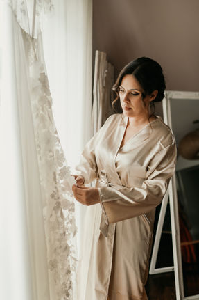 Elle a choisi la robe Crépuscule de la créatrice Elsa Gary, qu'elle a personnalisé avec de magnifiques manches papillon en dentelle, un dos en V et une jupe en mousseline sans plis. Emilie a également pu trouver sa lingerie dos nu au showroom